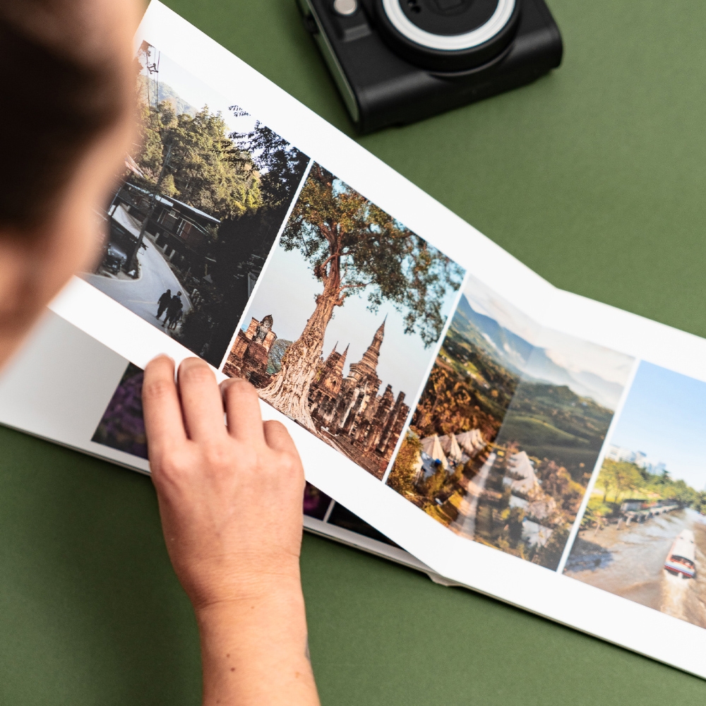 A abertura panorâmica, combinada com a impressão em papel fotográfico Fujifilm de alta qualidade, oferece uma visualização contínua das suas fotos, sem cortes ou partes ocultas.